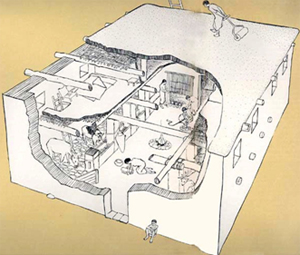 첨부한 그림을 참고하면, 집의 중앙에 불을 피운 화덕이 있다. 화덕 밑에는 한 여인이 맷돌을 사용하여 곡식을 갈고 있다. 그리고 화덕 위에는 석회암을 파서 만든 물 웅덩이에서 물을 긷는 모습을 볼 수 있다. 그 옆으로 한 여인이 서서 직조틀에 직물을 짜고 있다. 집으로 들어가는 문 왼쪽으로 축사가 있다. 그 축사 위의 이층은 가족의 침실이다. 침실을 축사 위층에 만든 이유는 겨울철 가축으로부터 온기가 위층으로 전달되었기 때문이다. 이층의 침실은 한 가족이 충분히 잠자고 쉴 수 있는 공간이다.