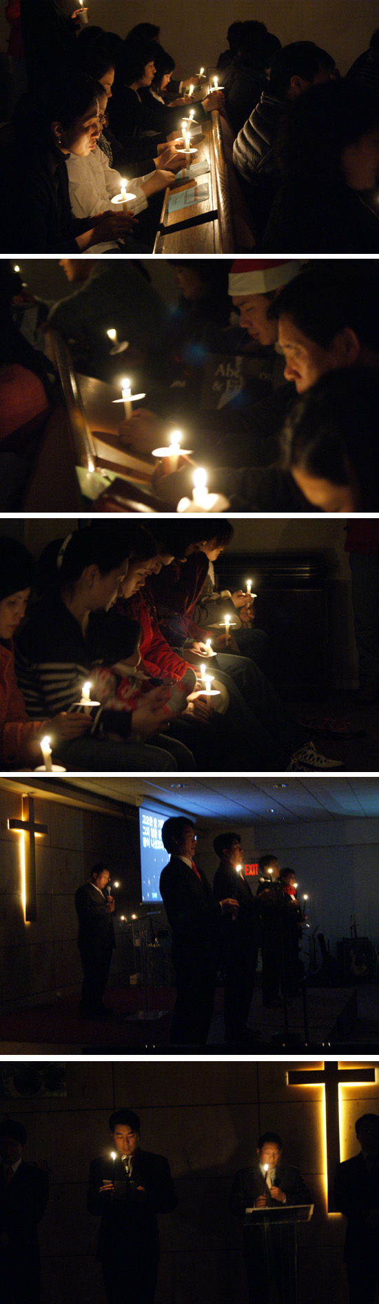 성도들은 각자 촛불을 하나씩 쥐고 예수님의 오심과 그 분의 희생으로 말미암은 구원에 대해 깊이 묵상하는 시간을 가졌다. 양승호 목사의 손에서 시작된 촛불은 부교역자에게, 또 부교역자에게 전해진 촛불은 장로로부터 모든 성도들에게 옮겨지며 어두웠던 성전이 환해졌다.