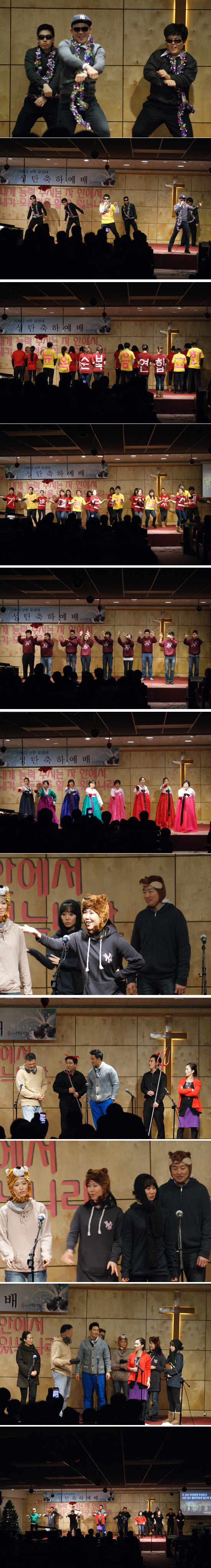깜짝 실력을 발휘한 이들도 있었다. 오승찬 장로는 통기타를 악보 없이 자유롭게 연주하면서 은은한 풍의 캐롤을 성도들에게 선사했다. 김선종 안수집사는 색소폰 캐롤 연주로 큰 호응을 얻었다. 이밖에도 청년대학부는 ‘강남 스타일’을 패러디한 ‘순복음 스타일’로 큰 웃음을 자아내게 했고 횃불선교회는 ‘현대판 흥부와 놀부’ 뮤지컬로 웃음과 감동을 줬다.