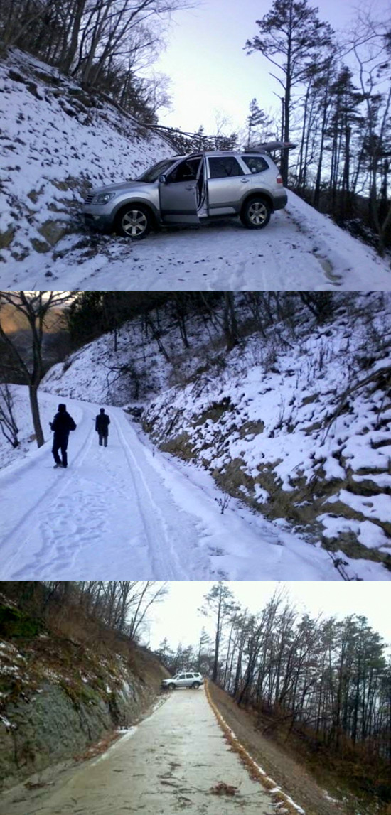 | ▲위 두 사진은 지난 12일 눈 쌓인 가파른 내리막길에서 차가 낭떠러지로 떨어지지 않고 수로에 빠진 장면. 아래 사진은 차를 견인할 수 있을 만큼 기온이 급상승하고 장대비로 눈이 완전히 녹은 이틀 후 장면 |
