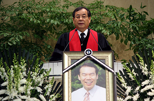| ▲조남수 목사가 고인의 영정 뒤에서 설교를 전하고 있다. ⓒ신태진 기자 |