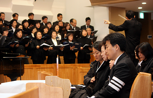 | ▲장남 황진훈 씨 등 유족들이 눈을 감고 성가대의 조가를 듣고 있다. ⓒ신태진 기자 |