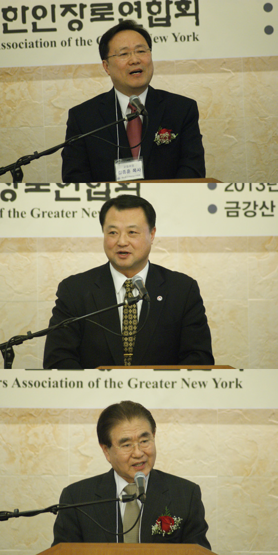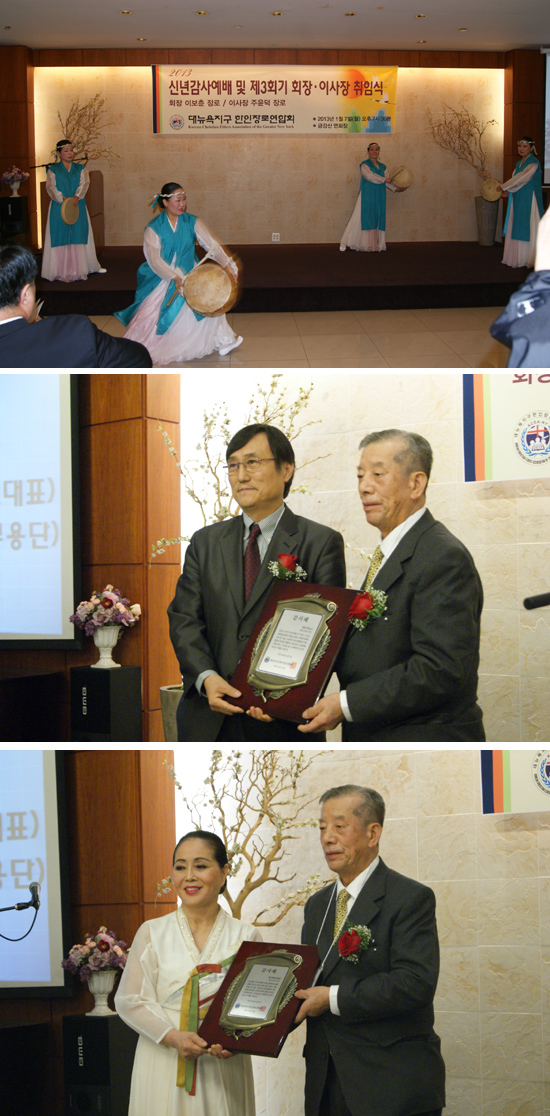 대뉴욕지구한인장로연합회(회장 이보춘 장로) 2013 신년감사예배 및 제3회기 회장·이사장 취임식이 7일 오후7시30분 금강산 연회장에서 개최됐다. 이날 취임한 이보춘 회장과 주윤덕 이사장은 선교의 발전을 돕고 친목을 도모하기 위한 단체의 설립 취지에 따라 성실히 복음전파와 화합을 위해 힘쓸 것을 다짐했다.