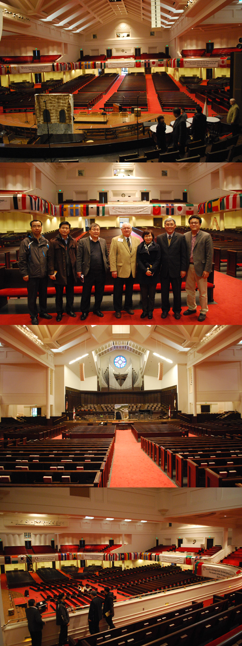 예배당은 1층 2000석과 2층 1000석을 합쳐 총 3000석 규모의 전통 교회의 모습이었다. 예배당에는 교회가 선교하고 있는 국가들이 국기를 걸어놓아 성도들이 선교에 대한 관심을 잃지 않도록 돕고 있는 점이 인상적이었다. 물론 한국의 태극기도 한 자리를 차지하고 있었다.