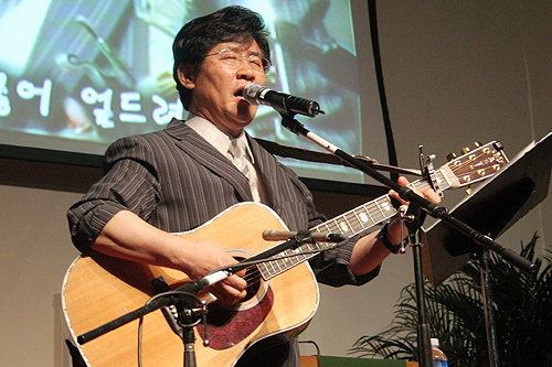 | ▲이날 윤장로는 자신의 히트곡과 복음성가를 고르게 불러 교회에 처음 나온 초신자들에게 거부감 없이 복음이 전파될 수 있도록 했다. ⓒ 이화영 기자 | |