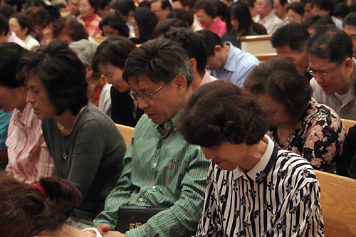| ▲3일간의 집회 일정동안 수 십명이 새롭게 결신했다. 사진은 성도들이 초신자들을 위해 기도하는 장면. ⓒ 이화영 기자 | |