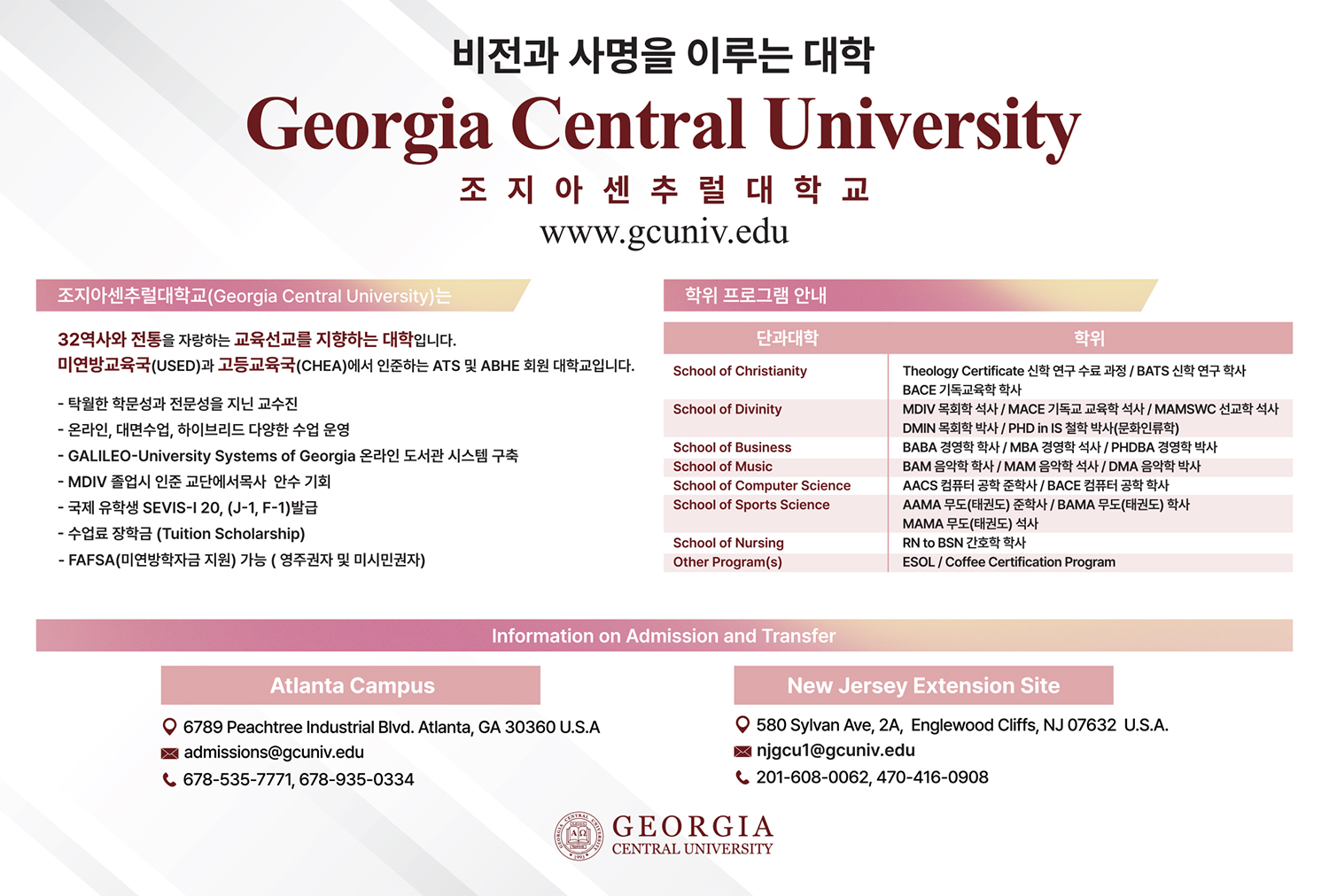 미국 조지아주 애틀랜타시에 위치한 조지아센추럴대학교(Georgia Central University: 총장 김창환 박사)가 뉴저지 교육국의 인가를 받아 뉴저지 캠퍼스를 잉
