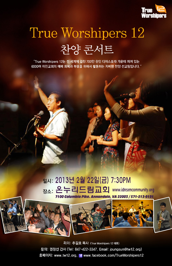 전세계 700만 한인 디아스포라 가운데 퍼져 있는 6,000여 이민교회의 예배 회복과 부흥을 위해서 활동하는 찬양 선교팀, ‘True Worshipers 12’(리더 추길호 목사)가 2월 22일(금) 저녁 7시30분 애난데일 소재 온누리드림교회(담임 이근…