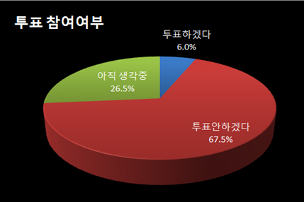 응답자의 67.5%(135명)가 오는 10월8일 실시되는 한인회장 선거에 투표하지 않겠다고 밝혔다. 투표여부를 아직 생각 중이라고 답한 사람도 53명(26.5%)에 달했고, 투표하겠다고 응답한 사람은 불과 12명(6%)에 불과했다. 한인사회가 한… 인종넘은 교회들 “미국의 영적 부패 회개”