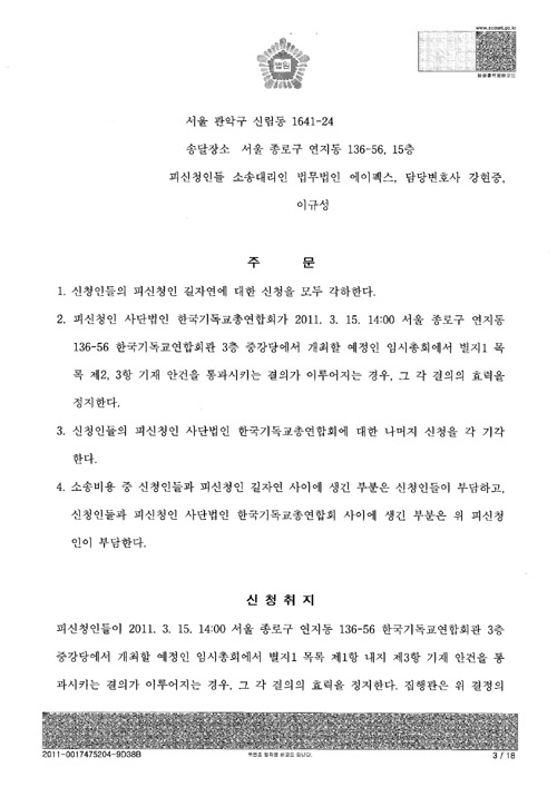 • [서울중앙지법의 ‘총회개최금지가처분’ 판결문 전문]