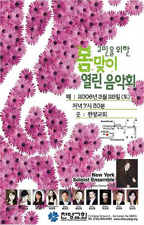 뉴저지 서머셋에 위치한 찬양교회(담임 허봉기 목사)는 오는 3월 25일(토) 오후 7시 30분, 지역 주민들을 위한 ‘봄맞이 열린 음악회’를 연다. 음악회에는 뉴욕솔리스트앙상블과 피아니스트 이현자