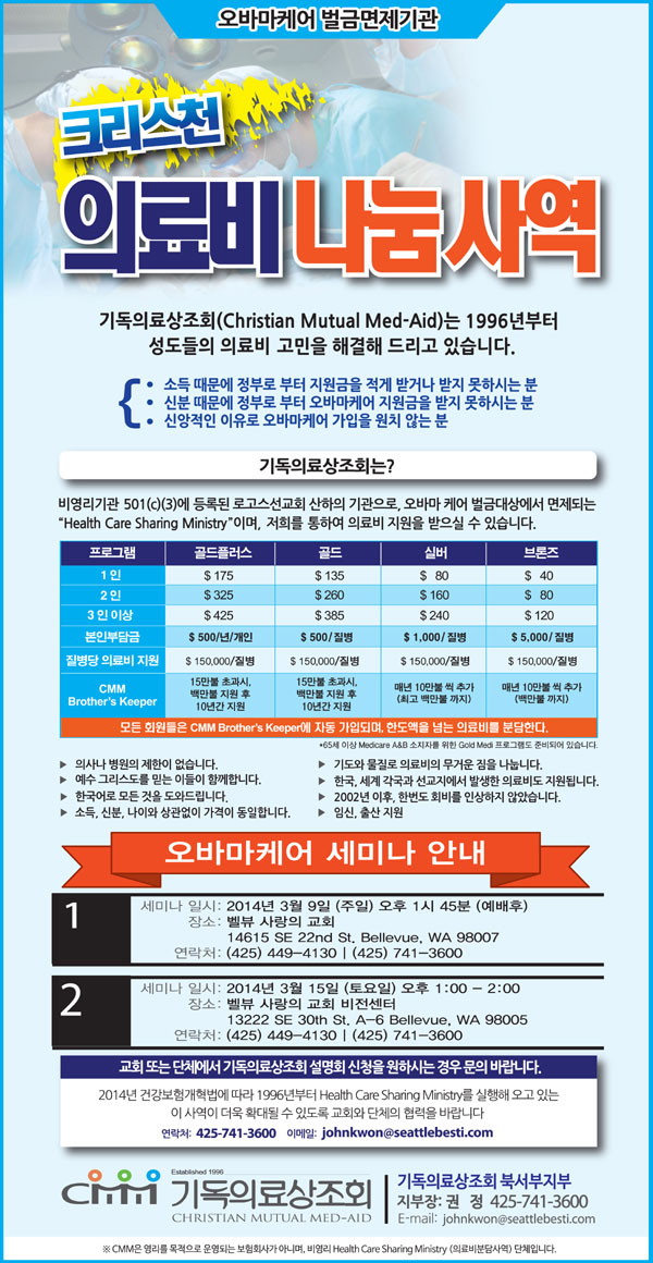 '오바마케어 및 기독의료플랜' 설명회가 오는 9일(주일)과 15일(토) 벨뷰 사랑의교회(담임 조영훈 목사)에서 열린다.