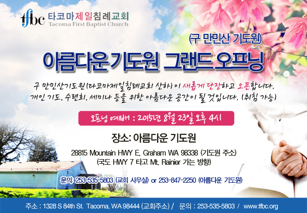 타코마제일침례교회(담임 최성은 목사) 산하 기도원인 아름다운 기도원(구 만민산 기도원)이 새롭게 단장하고 오는 23일(주일) 오후 4시 개원한다. 아름다운 기도원은 취침이 가능한 년 중 개인 기도 뿐 아니라, 수련회, 세미나 …