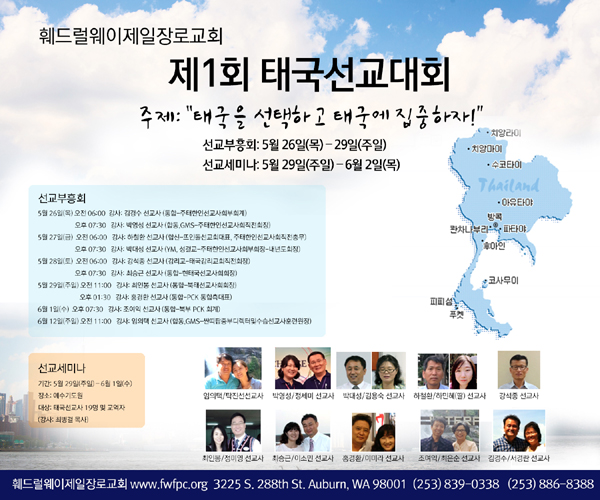 훼드럴웨이제일장로교회(담임 최병걸 목사)가 오는 26일(목) 부터 내달 2일(목) "태국을 선택하고 태국에 집중하자!"란 주제를 가지고 제1회 태국선교대회를 개최한다.