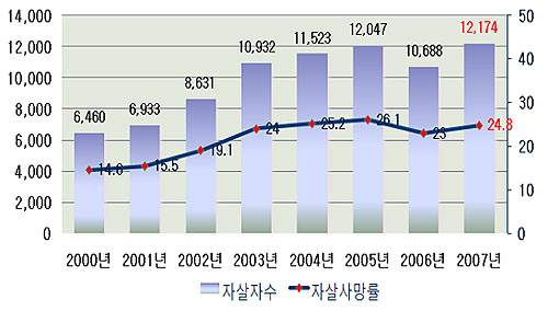 ‘OECD 자살률 1위국’이라는 오명에서 벗어나기 위한 범정부 차원의 종합대책이 내년부터 2013년까지 5개년 계획으로 시행된다. 보건복지가족부(장관 전재희, 이하 보건부)는 현재 인구 10만명당 24.8명